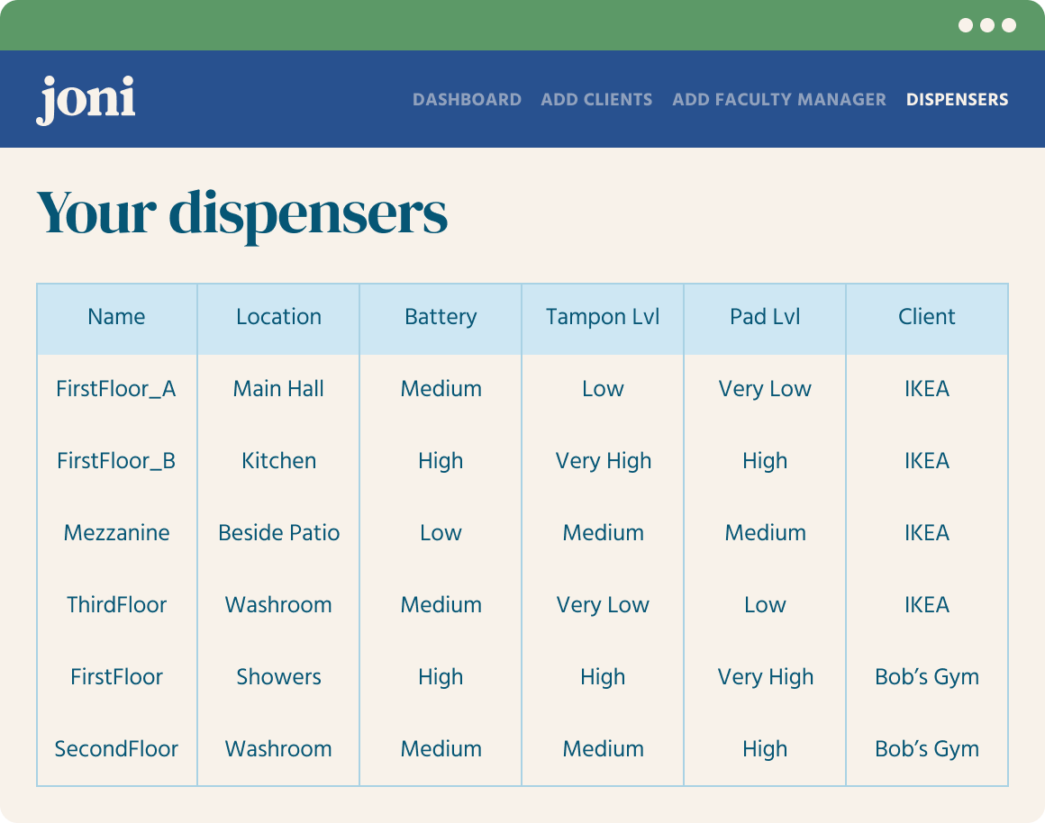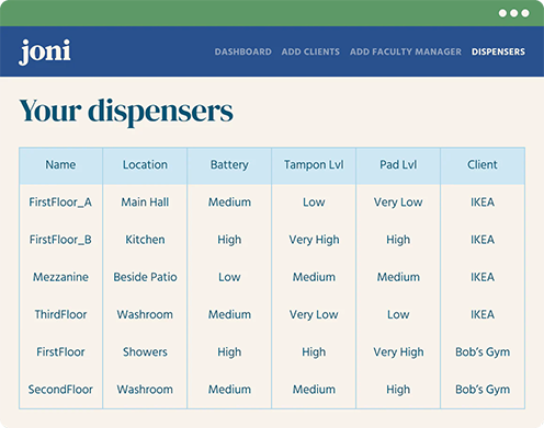 3. Contact us at sales@getjoni.com. This is ideal for facility management companies and large organizations who may need assistance with a custom solution, developing a program, or wish to pilot a period care initiative first.